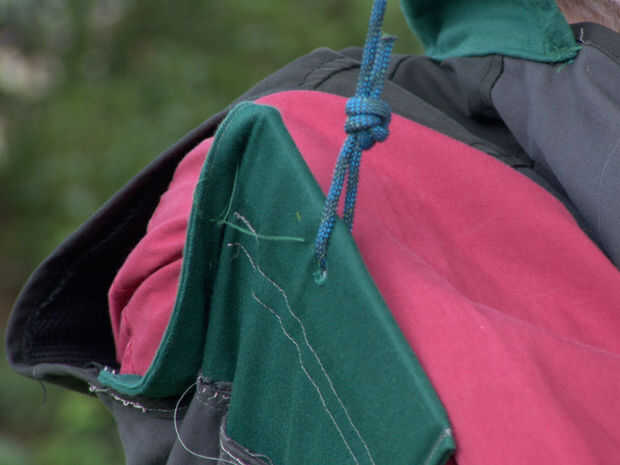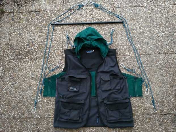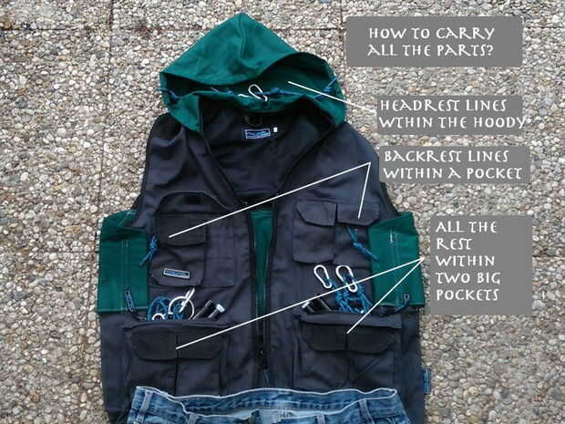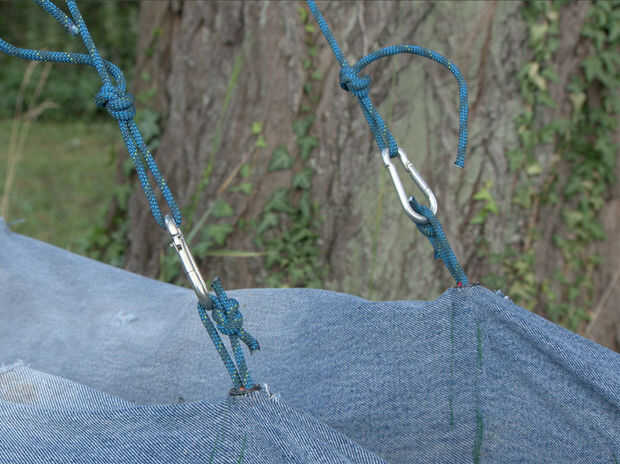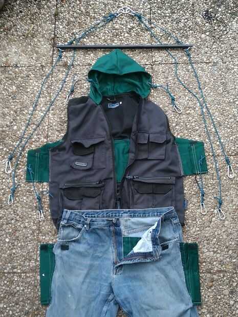 La construcción tiene que ser fuerte y confiable. Para las líneas usé 4mm dyneema. Para el tubo de aluminio de spacerbar (4 piezas de 15cm de largo) de un bastón plegable. Mosquetones y anillos son de acero.