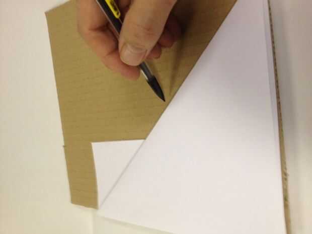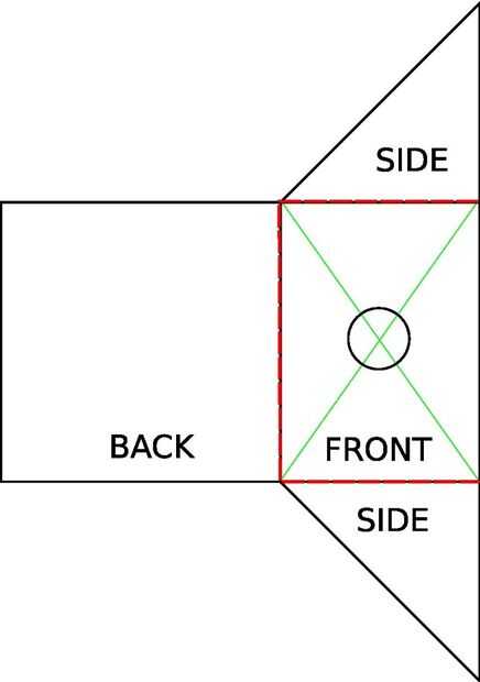 El frente es el tamaño de una hoja de papel A4. La pieza de atrás cuadrada inclinada tiene una longitud igual que el lado más largo de un papel A4. Los dos lados son como un papel A4 arrugado como un triángulo de ángulo recto. Marque una línea en el panel frontal que une las esquinas opuestas por lo que puede averiguar dónde está el centro. Puede utilizar el papel y marca alrededor de él para obtener las formas.