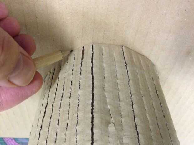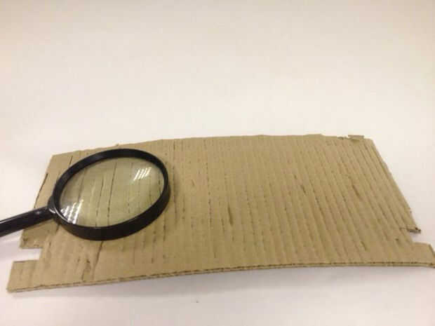 El barril de lente es un poco complicado, aquí usamos una tira de tarjeta y arrugada para hacerla doblar alrededor de la lente fácilmente. Si tienes una lupa es práctico mantener para el ajuste, en este caso usted puede hacer una ranura en un extremo de la tira de la manija.