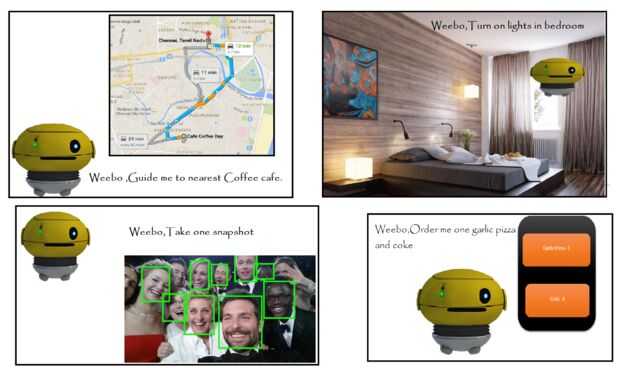Weebo es Bluetooth y Wi-Fi habilitado para facilitar la comunicación efectiva. Viene con GPS para rastrear su ubicación. Está equipado con una serie de sensores, para detectar el ambiente (temperatura, humedad, etc.). Sensor de inercia (acelerómetro, girómetro, magnetómetro) para el movimiento estable. Ultrasónicos, sensores de IR junto con la cámara para detectar obstáculos y encontrar la ruta adecuada, haciendo Weebo para mover sólo como a humanos. Weebo no es algo mecánico, es un robot social. Puede reconocer a las personas de su discurso, rasgos faciales, no se limita a etiquetar personas en fotos, pero también puede Lee las emociones, responder a la gente. (Por ejemplo: Buenos días, John). Se dispone de encendiendo las luces a la gestión de calendarios sociales, lectura de cuentos para dormir para controlar la luz y la música en las fiestas. Viajar fuera puede convertirse en molestias como proporcionaría la mejor ruta de tráfico. (Por ejemplo: "Weebo, me recuerdan ir al camino de MG a 4:30, procesaría la información de tráfico y eligieron la mejor ruta y hora).