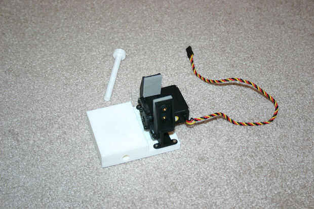 Sujeta a la muñeca de servo para el conector con tornillos pequeños. Empujó el montaje de la pinza sobre el actuador y asegura con el perno de plástico.
