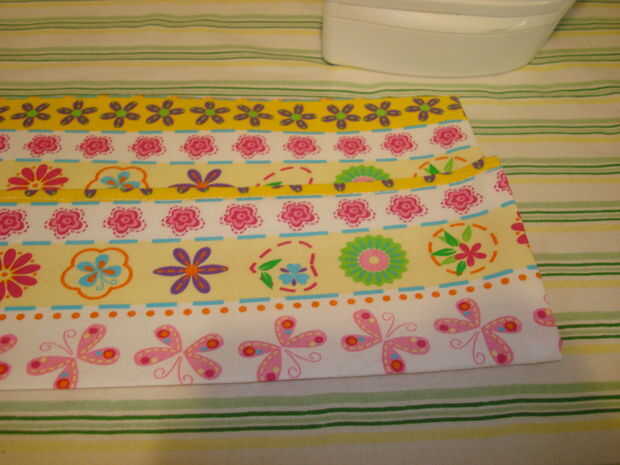 Gire la parte superior hacia abajo de cerca de 2 y 3/4 pulgadas y meta un poco bajo el dobladillo de la parte inferior de la tela como se muestra.