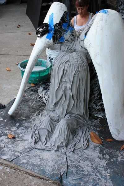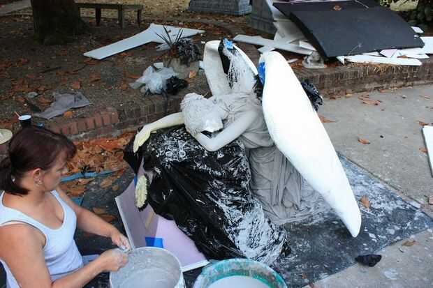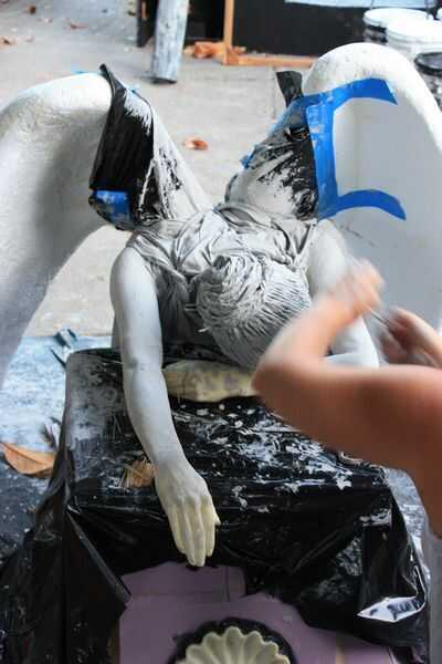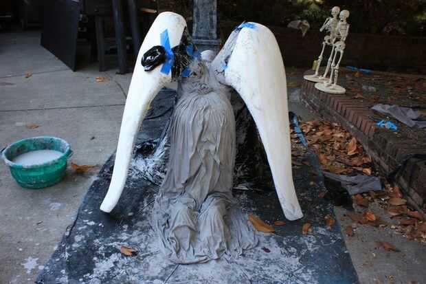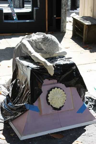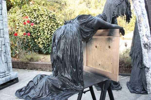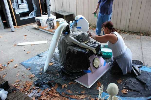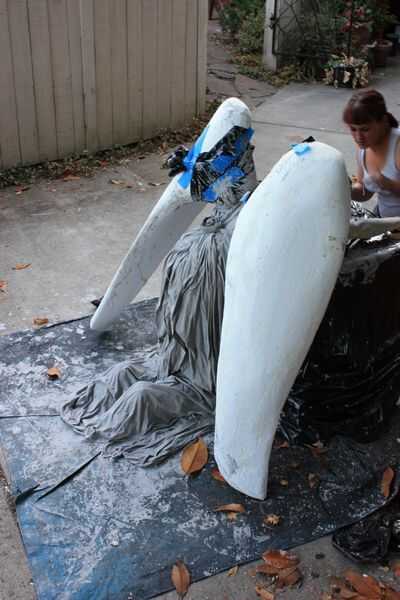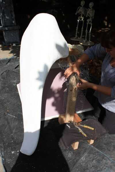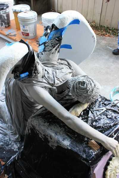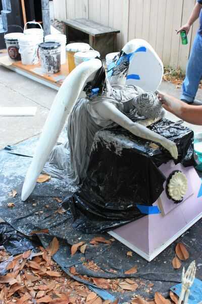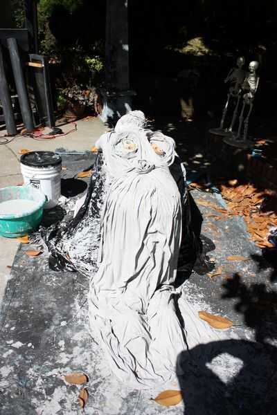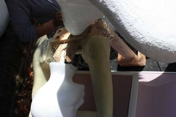 El cuerpo se hace con un simple marco de 2 x 4 y luego pollo alambre para agregar formulario. El alambre de pollo está cubierto de plástico de burbuja para ocultar las formas de alambre. Se utilizó un par de sábanas de algodón plano y había empapado en una mezcla de 4:1 de yeso compuesto y exteriores pintura de látex. Luego formó el vestido alrededor del cuerpo y deje que se seque.