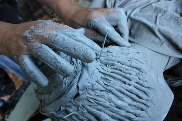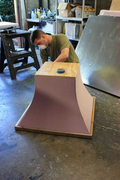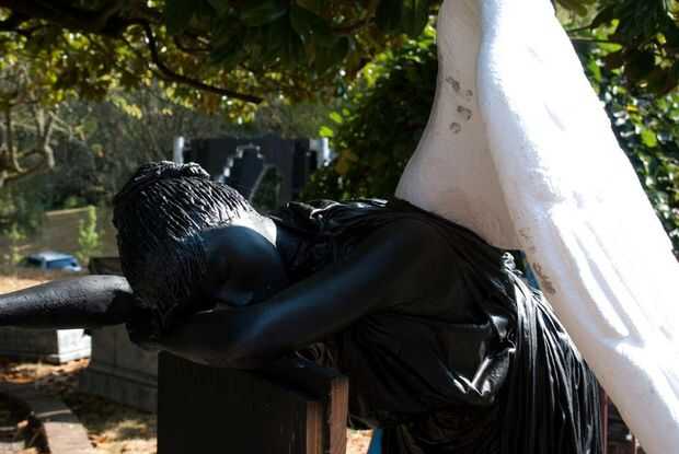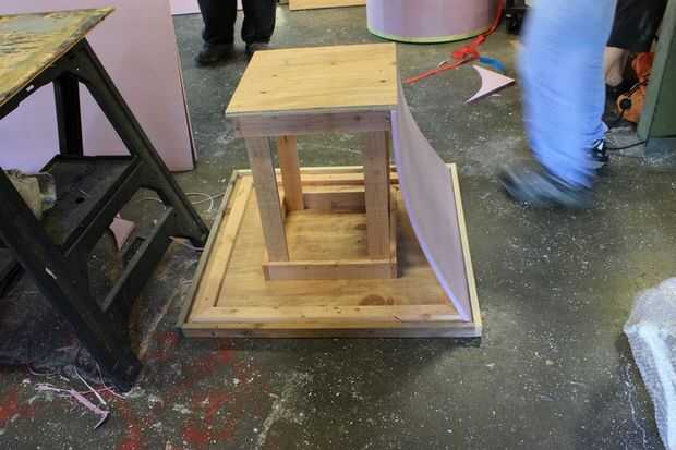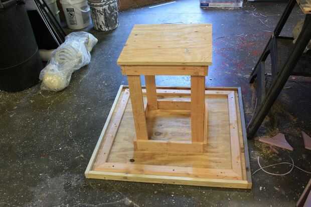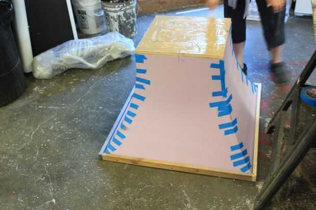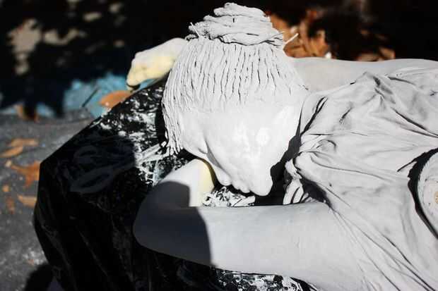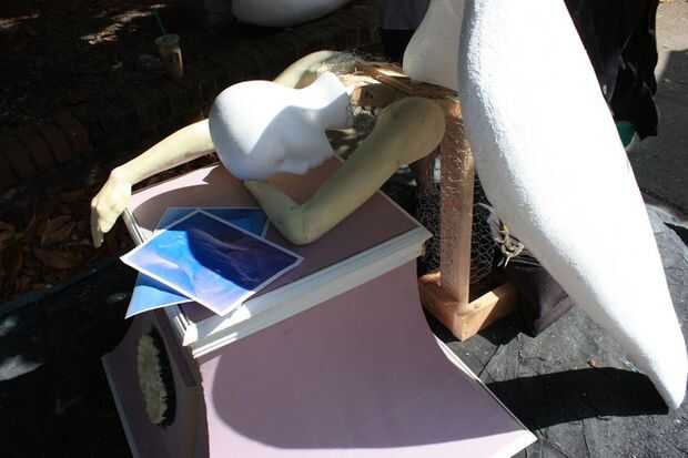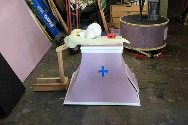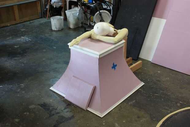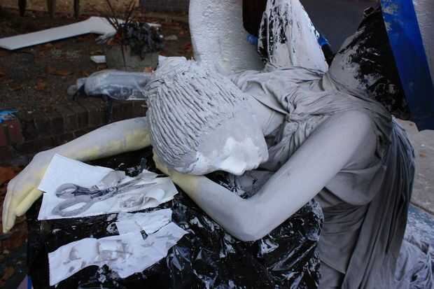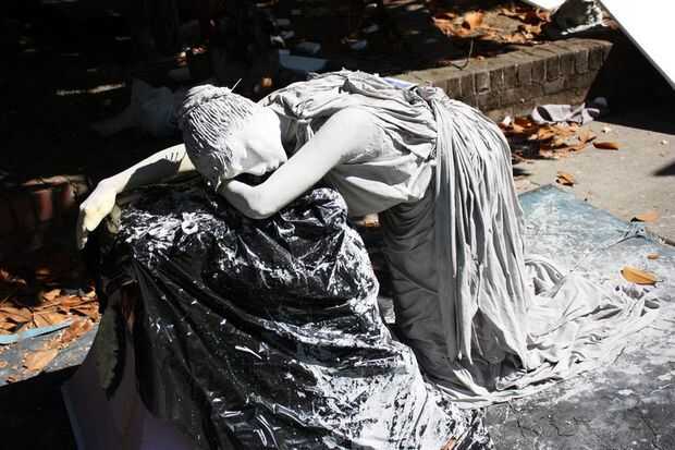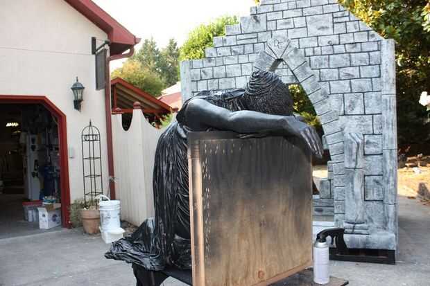 El cuerpo se hace con un simple marco de 2 x 4 y luego pollo alambre para agregar formulario. El alambre de pollo está cubierto de plástico de burbuja para ocultar las formas de alambre. Se utilizó un par de sábanas de algodón plano y había empapado en una mezcla de 4:1 de yeso compuesto y exteriores pintura de látex. Luego formó el vestido alrededor del cuerpo y deje que se seque.