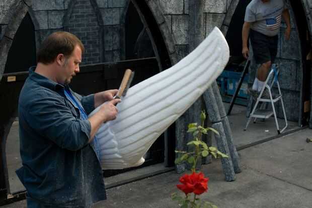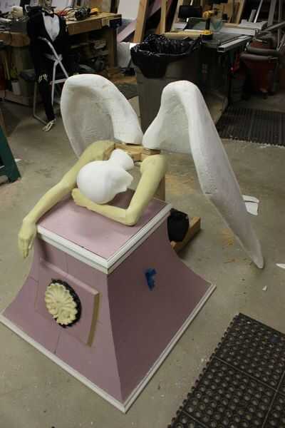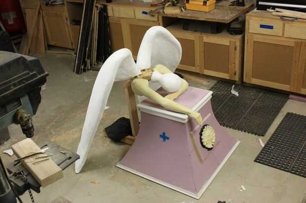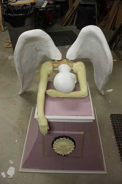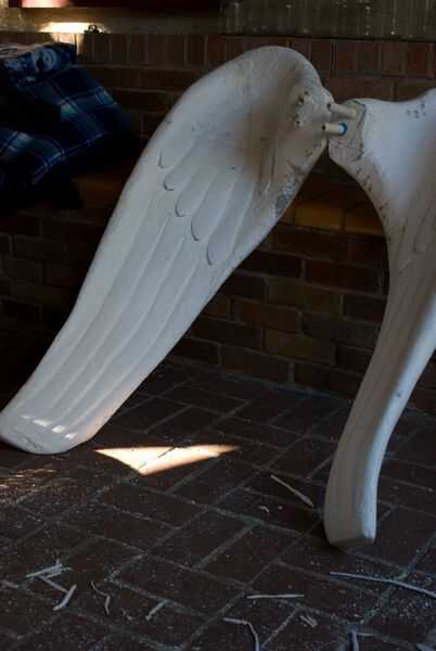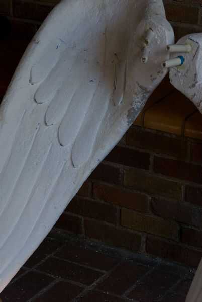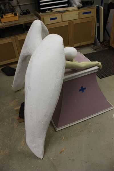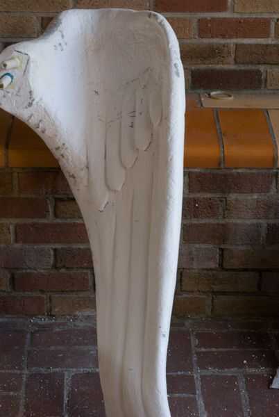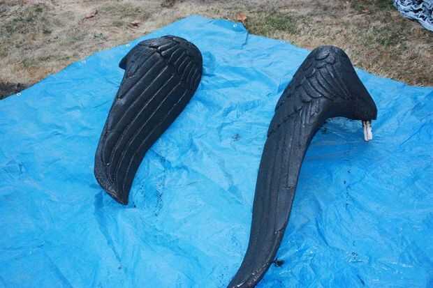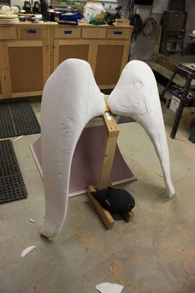 Las alas están hechas de 2" blanco aislante rígido que viene en hojas de 4'x 8'. Capas de la espuma y cortar, lijar y formó. Hemos pegado algunas formas de plumas de ala y otros que tallamos de la espuma para crear el aspecto adecuado. Somos 7/8 agujeros en los lados perforados e inserta el tubo de PVC de 1/2" y 2 usado parte espuma de expansión para asegurarlos en su lugar. Los tubos de PVC se insertan en orificios en la parte posterior del cuerpo para mantener las alas en su lugar.