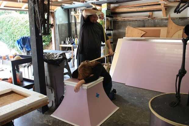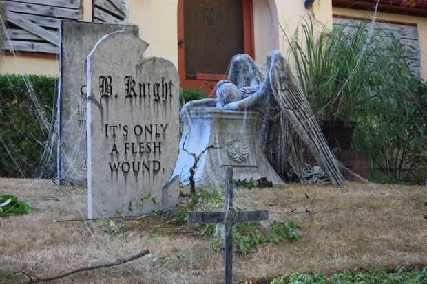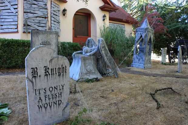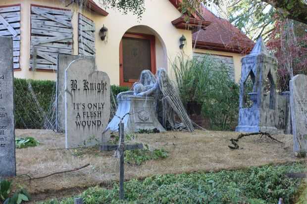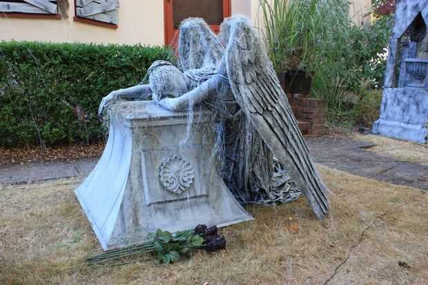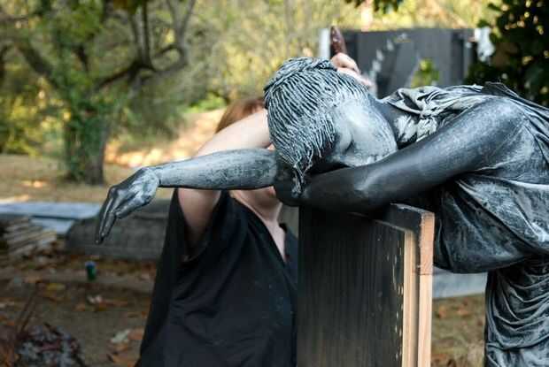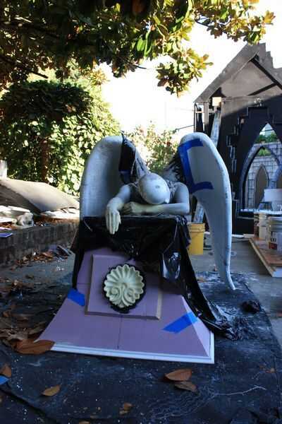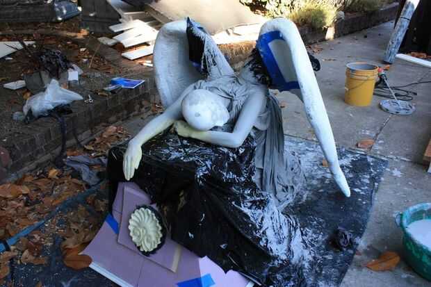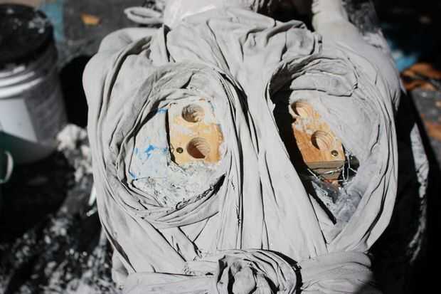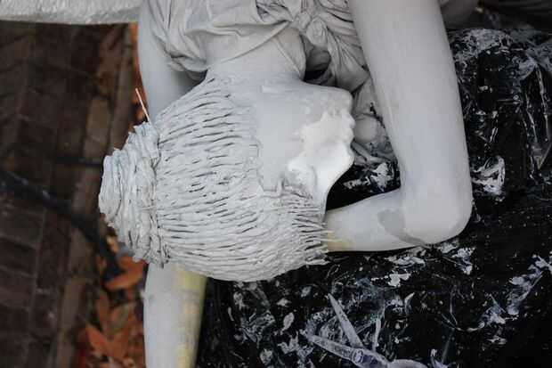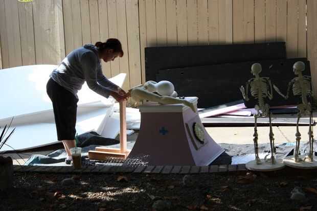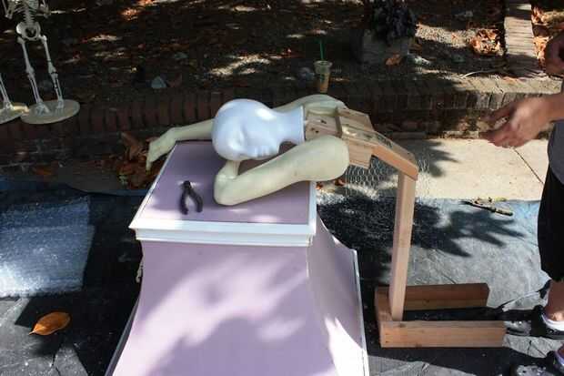La cabeza es una cabeza de peluca de mujer espuma común. Los brazos fueron comprados de paseo fantasma como un encargo que su goma espuma bolsa brazos femeninos del molde en espuma rígida. Había cortado el brazo izquierdo en el codo y lo había doblado 90 grados y entonces utiliza parte 2 expansión de espuma para encajarla y arena que parece real. También cortar la mano derecha en la muñeca y lo había doblado y había reformado también.