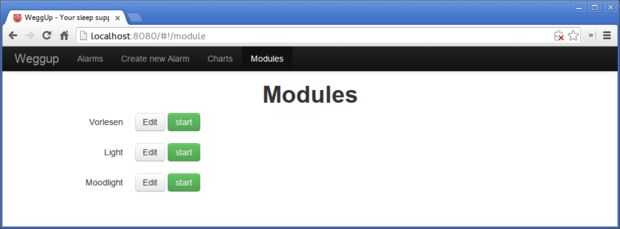 Todos los módulos pueden ser iniciados y detenidos desde una interfaz web. La configuración de todos los parámetros puede controlarse también allí. He implementado un simple administrador de configuración común para todos los módulos, por lo que puedo añadir nuevos fácilmente (cuando encuentro algún tiempo, crearé páginas de configuración para todos los módulos, que son más cómodos de utilizar).
