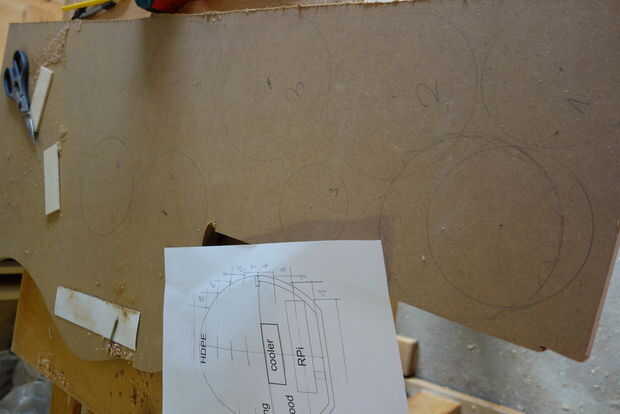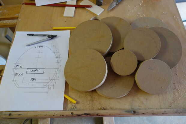 Para ello medí el diámetro de las capas de inkscape (imprime a su tamaño final), cortar los círculos y perforado en su totalidad en el centro (en el diámetro de una varilla roscada tenía por ahí).