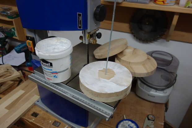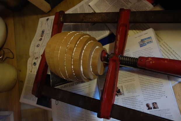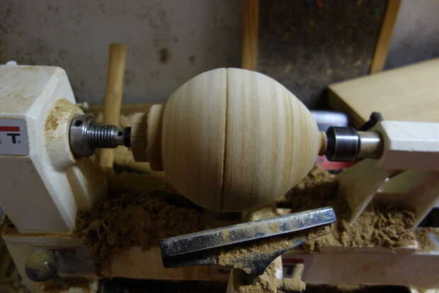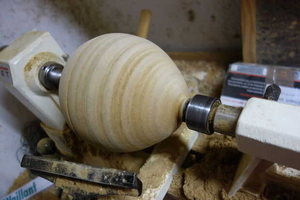 Para llegar lo más cerca posible de mis esquemas me había pegado los esquemas en una hoja fina de multiplex y córtelo hacia fuera, para que tuviera una plantilla, que yo podía sostener contra el huevo en el torno.