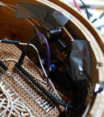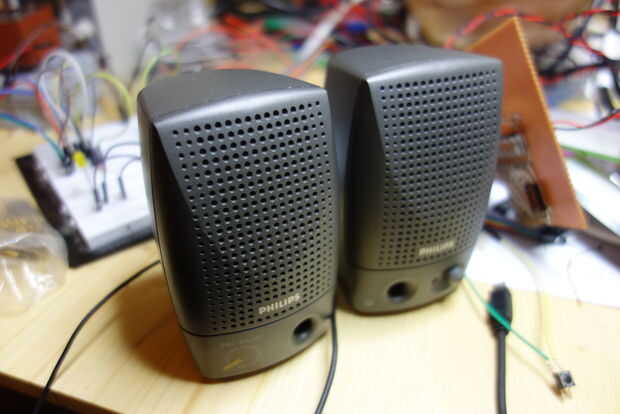 Para salida de sonido He rasgado aparte unos altavoces de pc activo viejo que funcionan a 5V. Usé la placa completa y sólo ponerlo en apagado vía pin 4 a través de un transistor. La Junta está conectada vía el jack de 3,5 mm a la frambuesa (vea el "paso de problemas" por qué tenía que construir en una posibilidad para apagarlo).