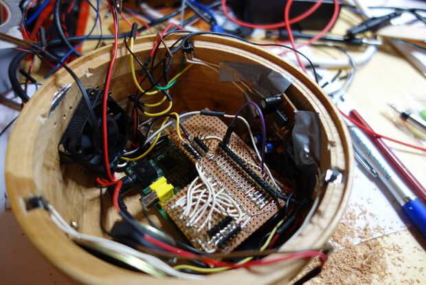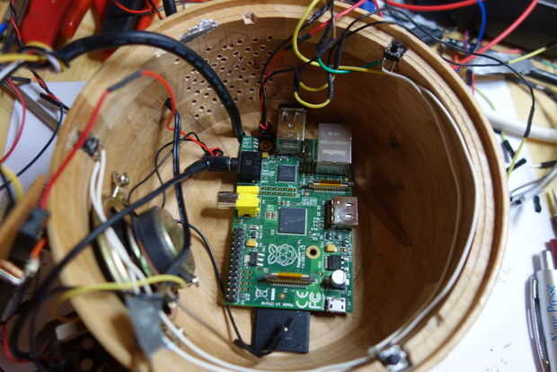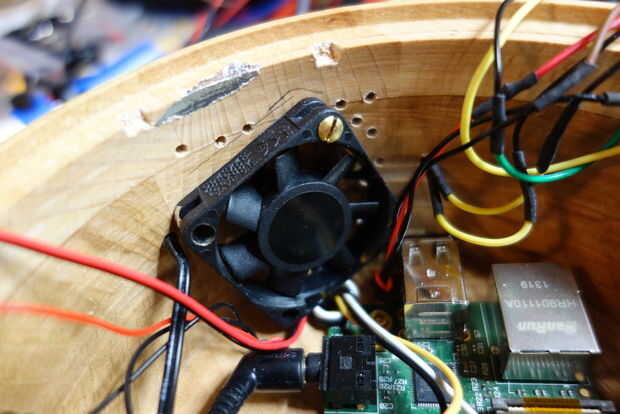 La frambuesa Pi se atornilla a la parte inferior, el ventilador se atornilla a los orificios y se atornilla el altavoz al lado.
