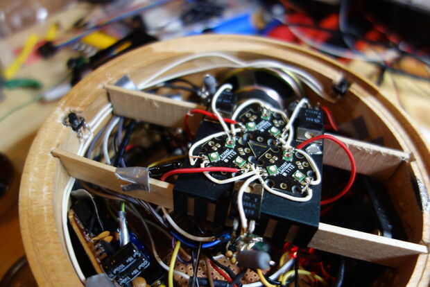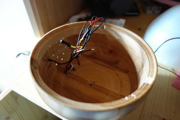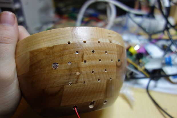 Como se puede ver en las primeras imágenes, perforar muchos agujeros pequeños para el ventilador, 2 más grandes de la ldr y el termistor, así como 2 agujeros más pequeños para los acelerómetros y 1 agujero más grande para la potencia de la línea de suministro. Yo también algunos agujeros perforados en el lado donde el altavoz se monta para conseguir la mejor acústica.