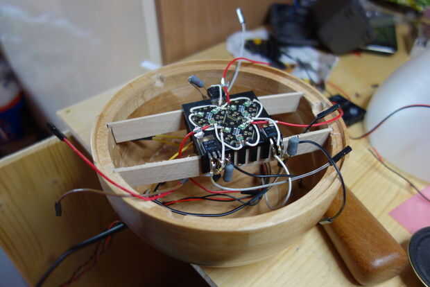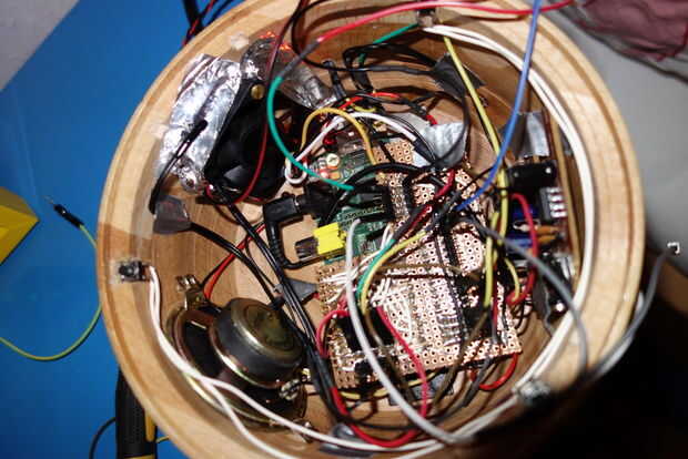El escudo está conectado en el Pi y el tablero de sonido es con cinta de ducto en el lado opuesto del altavoz.