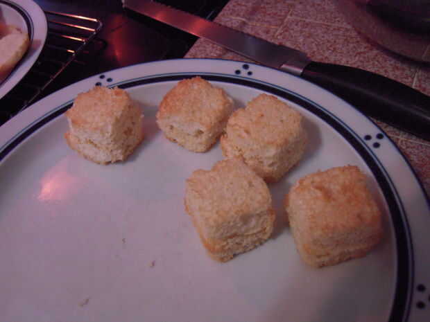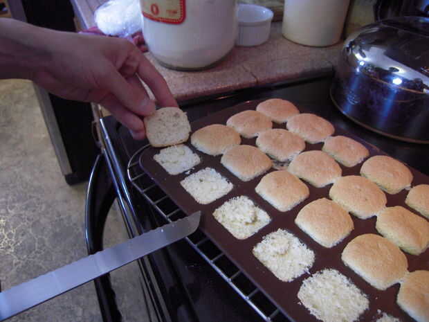 Después de sacar el cubecakes del horno y deje enfriar por 5-10 minutos cortar la parte superior que ha aumentado en la parte superior del molde para obtener un bonito ladrillo o'cake.  Debe tener un número par para apilar uno encima del otro para hacer cubos pequeños.