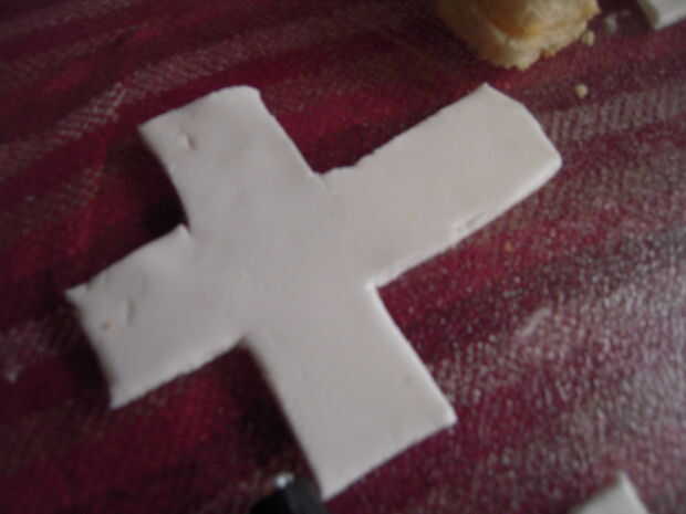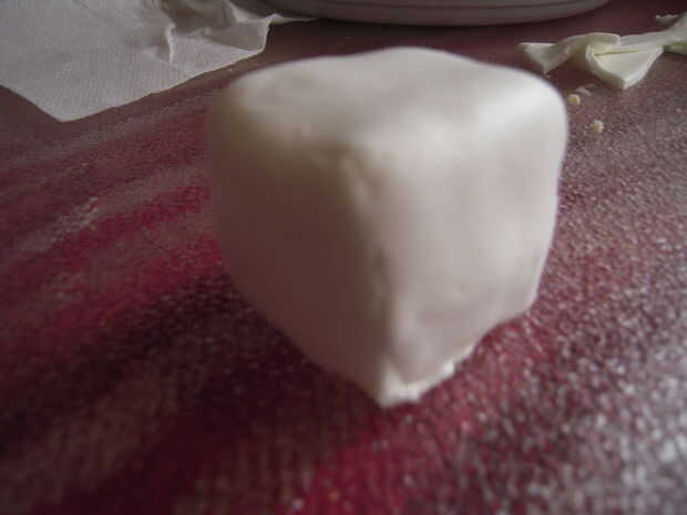Llegado el momento de cortar la parte exterior de su cubo corta una pequeña Cruz en la pasta de azúcar y mida con un cubo para obtener las dimensiones aproximadas.  Cuelgue el fondant sobre el cubecake y pellizcar los bordes del fondant para sella y crear una forma de cubo.  Esto es bastante fácil de hacer pero lleva un tiempo.  No dejes que ajustar demasiado porque se reseca y queremos añadirle unas cuantas cosas más.