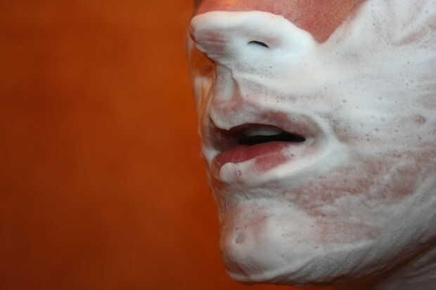 Enjabona tu cara otra vez. Vamos a hacer un a contrahilo afeitar ahora.