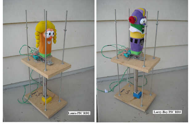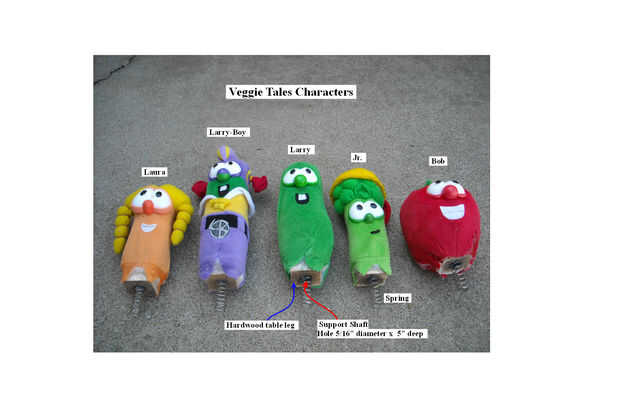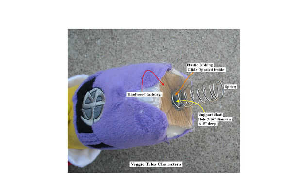 Los personajes de verduras son peluches peluches estándar. He quitado la mayor parte del relleno por lo que pude insertar el 1-1/2" madera cuadrada pata de la mesa. La madera dura fue cortada a longitudes y entonces perforada en el taladro para el casquillo de plástico que fue pegado con epoxy dentro de manera que pueda deslizarse fácilmente sobre el 5/16" todos hilo soporte eje. El buje con el resorte de plástico se pega con epoxi en su lugar.