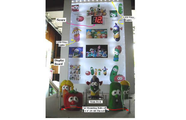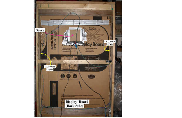 La tablilla es 30" L x 5-1/2" ancho x 73 "H.  La tablilla se une a la parte posterior de la base del gabinete mediante tornillos. El tablero de pantalla se hace de 1 "x 2" y 2 "x 4" madera tableros conforman la estructura del marco. Placas cartel blanco se utiliza para relleno en la fabricación de un tipo de caja de sombra Mostrar, el labio externo es 3-1/2" para las partes superior, derecha e izquierdas. He instalado blanco 5 m m LED en el interior labios apuntando hacia dentro para iluminar los carteles de veggie. La pantalla de puntuación está montada en la mitad superior de la tablilla. Solía cinta mantenga las costuras juntos y proporcionan una cubierta sobre el circuito de placa de exhibición.