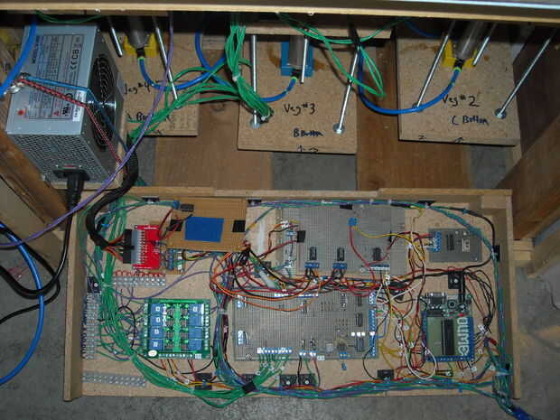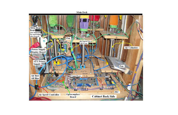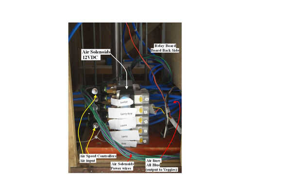 Ahora el código en el PIC va a determinar un número al azar y goto de la tabla de búsqueda para generar una lógica alta a PortD RD0, RD1, RD2, DR3 y R4 para que emerja la veggie. La salida del PIC va de entrada y de salida del optoacoplador IC 4N35. El optoacoplador eléctricamente aislantes alimentan el PIC de los electro componentes mecánicos debido al ruido y EMF con relé y solenoide están operando. La alta salida del optoacoplador 4N35 impulsa la placa de relé para activar el relé y enviar + 12vdc para alimentar los solenoides de aire. (MettleAir neumática válvulas 5/2 manera 4A210-08 12VDC (productos neumáticos)) los solenoides de aire envían aire presión en el cilindro de aire (Bimba, el cilindro de aire 6" viaje #BF-096-D) esto causará que las verduras subir y cuando el PIC se completa con el pequeño tiempo de retardo en el código se borrará PortD lógica bajo el optoacoplador, el relé, solenoide de aire se activará y pasará el carácter vegetariano. La foto pasará por rutina una y otra vez hasta que el temporizador termine con un poco alta de interrupción PortB RB0 para parar el juego y claro PortD. En la rutina de código de interrupción borrar archivos y configurar el juego para un nuevo juego y manteniendo la puntuación existente aparecida.