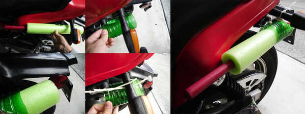 Encontrar un lugar apropiado en la bicicleta que aceptará el bonk de whack. La colocación debe asegurar el despliegue rápido manteniendo la bicicleta funcional. Elegí el trasero lado izquierdo, justo por encima de las clavijas del pasajero. Amarres de cable atados a través de las aberturas en el envase de plástico y conectados a la señal de la vuelta.