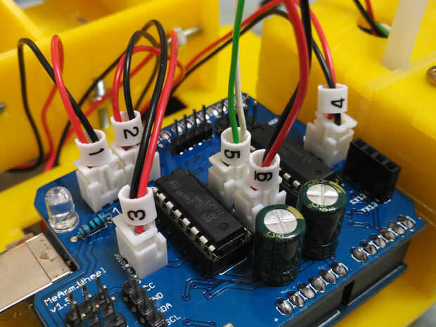 體感手臂車 (官網) 機構源自MeArm, 是結合藍牙體感搖控和超聲波偵測自動夾物的開源教育用手臂車, 藉由DIY套件和程式範例培養手作.程式設計和機電整合能力, 從學生到社會人士都適合玩. 夾爪和吸盤採模組化設計, 可自行替換.Lasercut.zip:雷切設計圖(3mm,2張A4壓克力板)curcuit.zip:擴展板電設圖(EagleCad)WheelArm.pdf:組裝步驟(英文版,當站方的中文版沒有亂碼後會提供中文版喔)Software.zip 解壓後包含:1. 安卓Apk檔和原始碼(