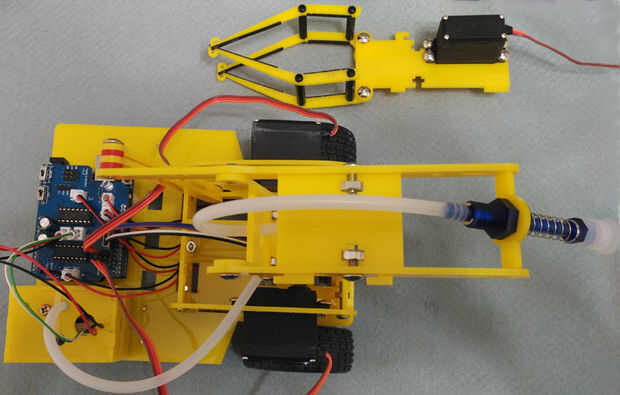 體感手臂車 (官網) 機構源自MeArm, 是結合藍牙體感搖控和超聲波偵測自動夾物的開源教育用手臂車, 藉由DIY套件和程式範例培養手作.程式設計和機電整合能力, 從學生到社會人士都適合玩. 夾爪和吸盤採模組化設計, 可自行替換.Lasercut.zip:雷切設計圖(3mm,2張A4壓克力板)curcuit.zip:擴展板電設圖(EagleCad)WheelArm.pdf:組裝步驟(英文版,當站方的中文版沒有亂碼後會提供中文版喔)Software.zip 解壓後包含:1. 安卓Apk檔和原始碼(