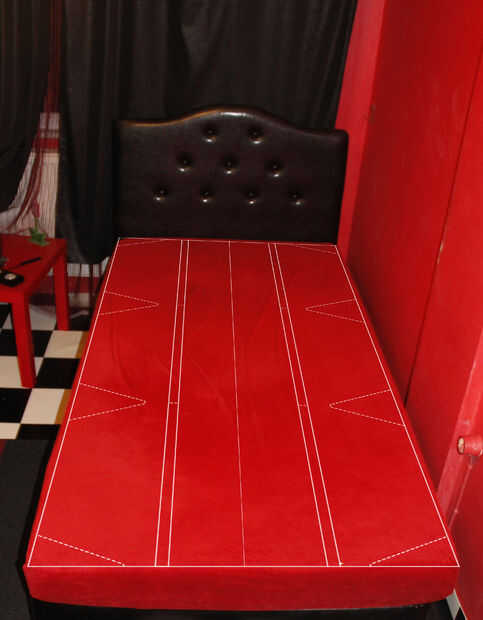 Cubrir la hoja de cama en cama aproximadamente 100 x 200 cm. Estimación de una línea media que las mitades de la hoja de cama. Dependiendo de la altura, anchura y profundidad de ustedes estar estructura decidan en dónde sería la articulación entre respaldo y asiento y dibujar contornos de estimación para el respaldo de sus sillas. Usted debe terminar con un plan áspero que se muestra.