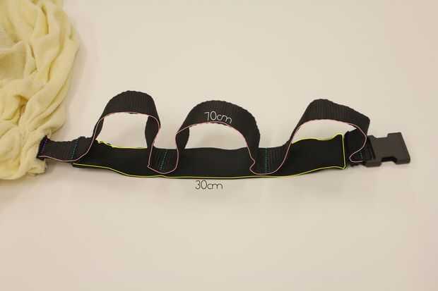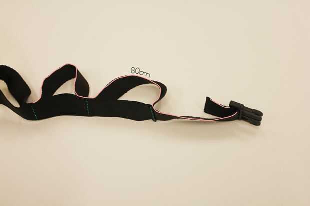 En este paso usted estará preparando colocar las correas. Para esto usé la medida de tres sillas al lado de uno nuevo. Esta vez los corté en dos. Una de 65 cm y una adición de 80 cm hasta aprox. 150 cm. marcar cuánto tiempo desea que sus lazos y decidir en cuántos bucles que desea correa sintética. Según la banda elástica se dividen en segmentos y marque las intersecciones con correa sintética. Unirlas y añadir Bum bolsa de pinzas en el extremo de cada tira para el ajuste fácil.