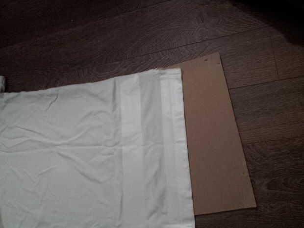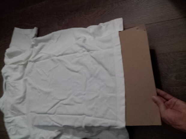 De este cartón de lugar de paso dentro de la manga larga también mantener la camisa plana y para evitar que la pintura de tela que se filtra a través de al otro lado. Obtener cinta de enmascarar y comenzar a grabar la camiseta alternativa con el mismo grosor. Una vez que la camisa se graba en ambos lados incluyendo la pintura de la tela de las mangas se aplica al material expuesto camisa. He pintado cada lado por separado para que tuviera suficiente tiempo para secar.