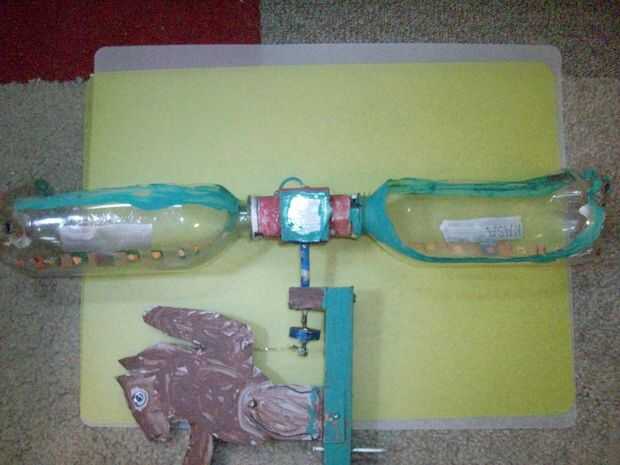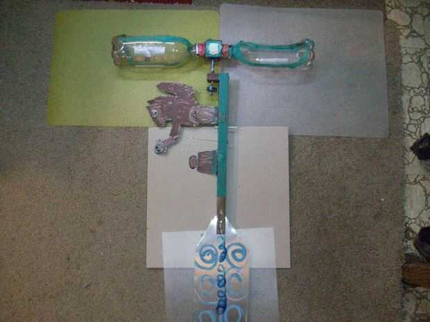 Asegúrese de que las botellas se giran para que se captura el viento y girar. Prueba con un soplo de aire. Monte en el eje.