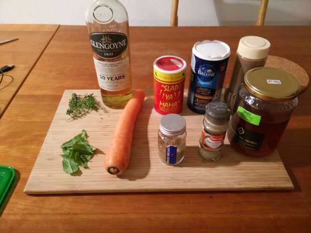 Especias y cosas para adobar: utilicé whisky, salvia, miel, sal, pimienta, una zanahoria y pino de Chile