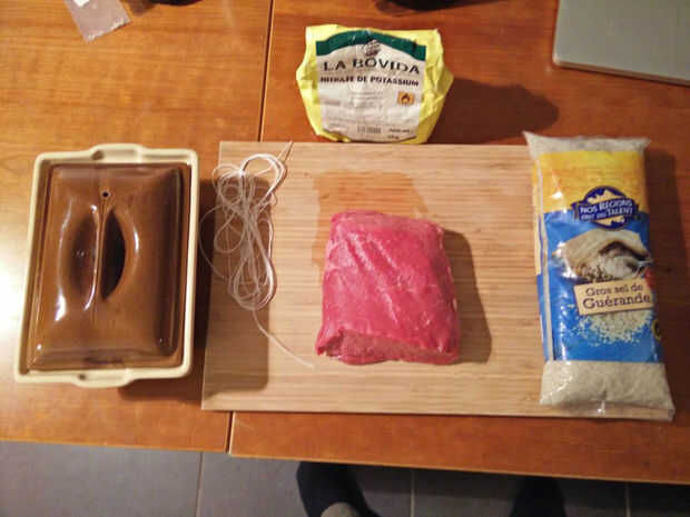 Había mezclado en la sal una cantidad (0,1% con respecto a la masa de sal) de nitrato de potasio, que compré en una tienda de suministros de alimentos profesional para muy barato (La Bovida, en Francia). El nitrato de potasio libera lentamente nitrito de potasio que ayuda a evitar que las bacterias (especialmente Clostridium botulinum) creciendo.
