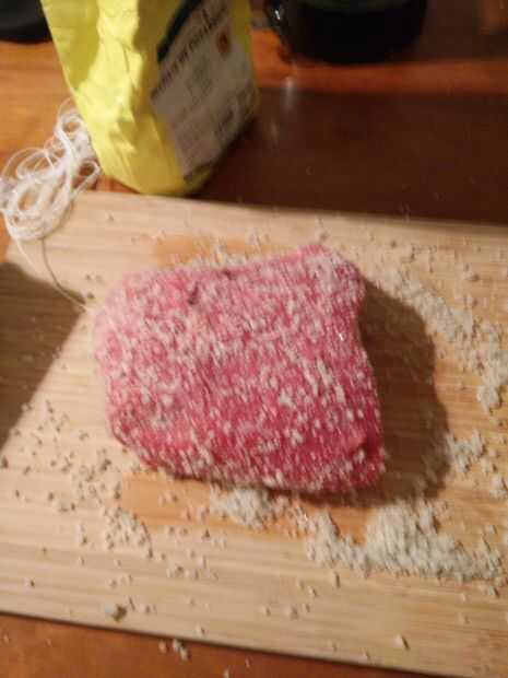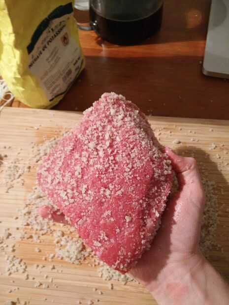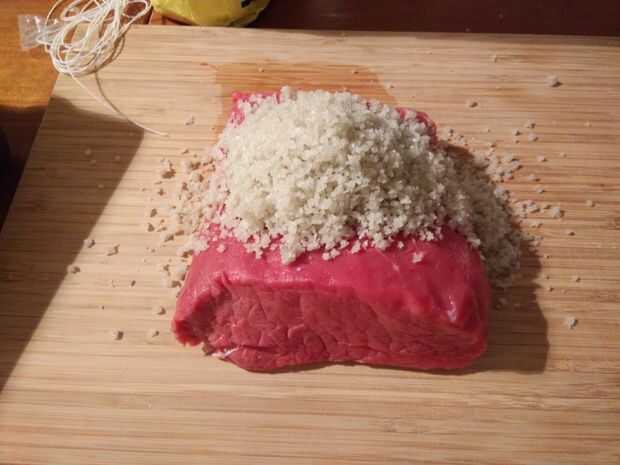 Puse una gran cantidad de esa mezcla de sal en el fondo de una terrina y frota la carne en poco más de él. He usado sal marina gruesa, algunas personas prefieren la sal de la mina para evitar que el sabor de yoduro. Creo que no importa mucho y el yoduro pasa a ser un antiséptico, que sólo puede ser bueno en la prevención de bacterias en la carne.