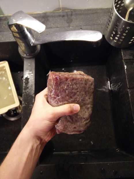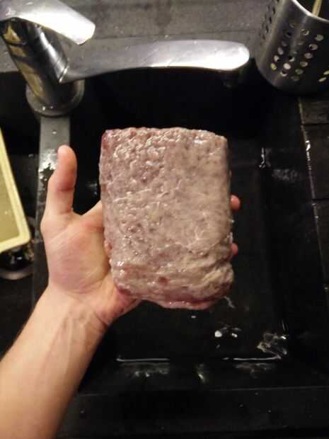 Esto va a quedar en la nevera durante 12 a 72 horas dependiendo del tamaño de la pieza de carne. Hice 24 horas para una pieza de 800 g (alrededor de 2 libras) de carne de vacuno.