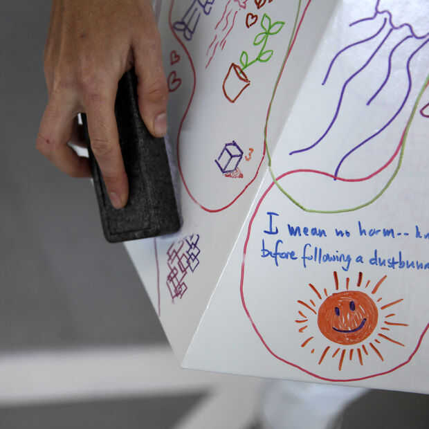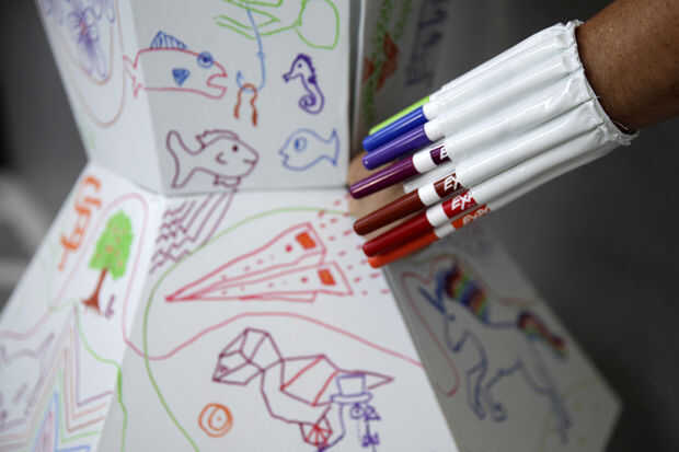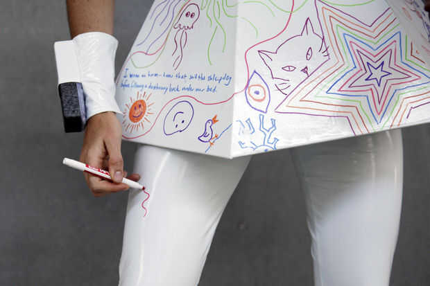 Mis objetivos de diseño fueron hacer algo un poco vestido que todavía proporciona una superficie rígida para facilitar la escritura y puede doblar completamente para el almacenaje. Tuve algunos látex tejido en casa que necesita ser utilizado, y encontró que si bien no es un substituto perfecto para una verdadera pizarra (puede ver un halo de lo que ha sido borrada), es bastante estrecha. Pintura de pizarra sería probablemente la opción más eficaz, pero me preocupaba que la pintura viruta a lo largo de las costuras sobre plegado plano. Lo que también me ha gustado sobre el látex es que todo en este equipo puede actuar como un seco borrar el tablero, incluyendo el pantalón y top.