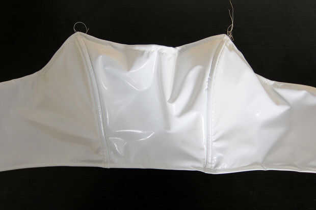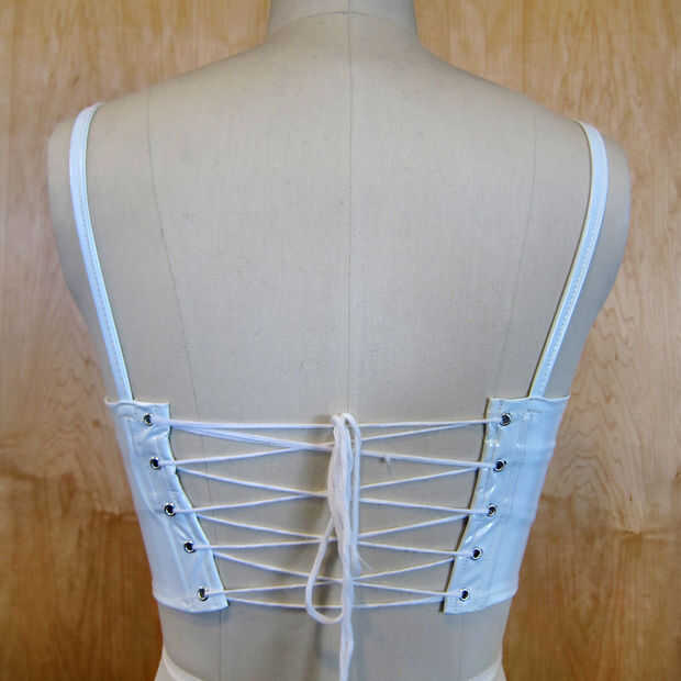 Para terminar la parte de atrás, doblé la espalda en pieza con un recuadro de tela no estire para apoyar los ojales, así como algunos deshuesado (mejor utilizar a ambos lados de los ojales, pero solo me puso en un lado). Incluso con la tela de estiramiento no detalle que mis ojales empiezan a vagar por lo elástico del látex es, por lo que le recomiendo usar los ojalillos caras más agradables si los tienes.