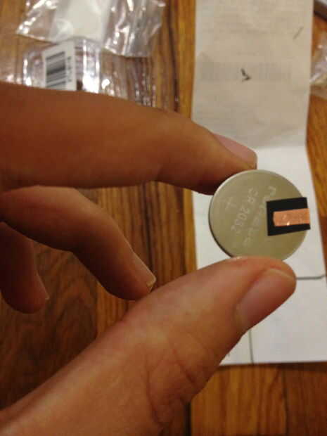 Con la cinta eléctrica y conductor, hacer que los lados positivos y negativos de la batería queden hacia arriba. Para ello puede poner cinta eléctrica va de un lado de la batería a la otra y utilice la cinta conductora que, asegurando que está tocando el lado negativo de la batería pero descansando encima de la cinta eléctrica en el lado positivo. Esto hará que por lo que es fácil de conectar un LED o un motor a un lado de la batería en lugar de tener una pierna tiene que envolver alrededor de cada lado.