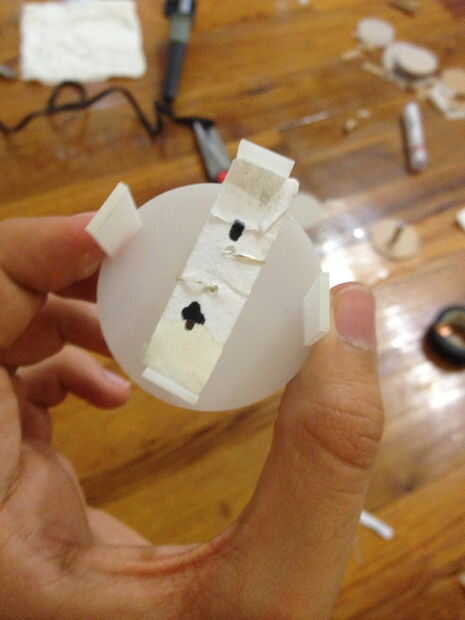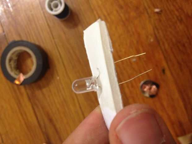 Ahora vas a colocar pedazos de tabla pequeña de LED que creó (el corte circular salidas con las piernas). Usé un núcleo de espuma para mantener el led en su lugar, pero probablemente sería más fácil si tienes laser cortar para mantener el LED y los imanes en el lugar que usted habría hecho antes de tiempo. Que penetra los agujeros a través de la base de la espuma y envuelto las patas del LED alrededor de la base que luego se pega en su lugar en la parte inferior de las piernas de la tabla, con suficiente espacio para colocar imanes y conectarse más adelante las piezas de batería que nos hicieron. Luego marque los extremos de los LEDs como negativo y positivo por lo que sería más fácil hacer un seguimiento de qué extremo que cuando trata de conectar a las baterías correctamente.