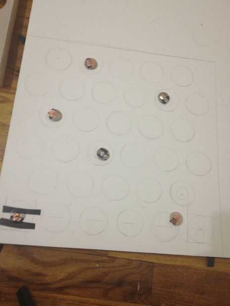 Ahora es el momento de insertar las baterías en la parte inferior de la Junta y cubre con su tapa. En las fotografías se puede ver que he encontrado donde cada uno de los conjuntos fueron en el tablero y dibujó un círculo en el mismo lugar en el tablero inferior encontró el centro, cortar un círculo y encajado la batería para que las piezas LED y Motor encajan directamente en las pilas. Esta es una forma de hacerlo, pero una manera más fácil sería tener este fondo panel pre corte con el resto de su láser cortar materiales que sólo pueden mover las baterías en su lugar.