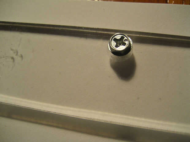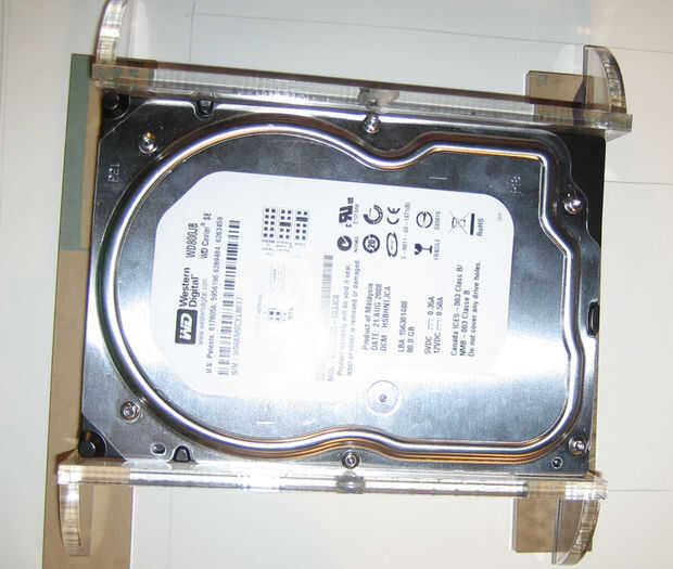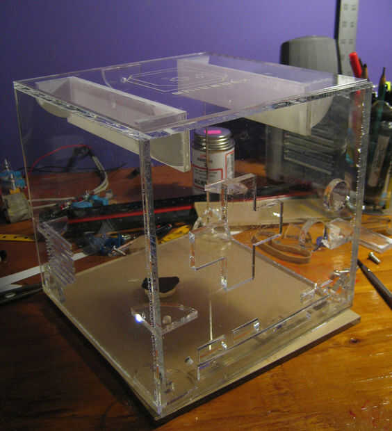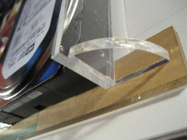 Ahora que sus piezas estén listos es hora de poner todo junto. Empecé a montar la parte superior del cubo utilizando la jeringa y el líquido soldar 3 cemento acrílico; en este punto las cosas habían cambiado en el diseño y es claro que el disco duro no encajaría en el lado como había planeado, sino que el panel superior era un ajuste perfecto. Tomé los dos pequeños pedazos rectangulares de plexi y perforaron dos agujeros en ellos para la celebración de la unidad de disco duro, además usé un par de los empalmes de la esquina para asegurar las piezas de plexi para el panel superior.