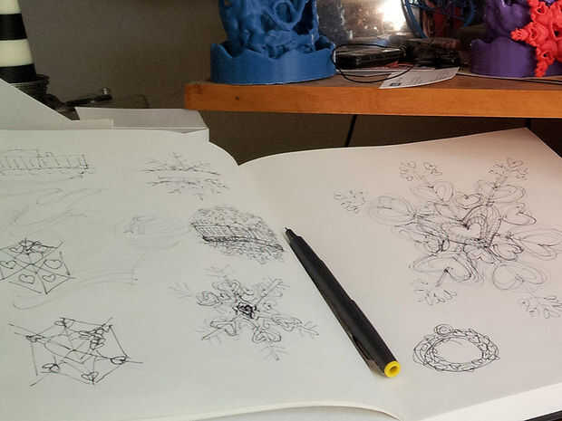 El primer paso para conseguir una buena impresión es dibujar miniaturas o dibujos pequeños, de una idea en papel. Formas y de ideas bastante rápida y relativamente fácil cambiar en el papel. Hubo al menos una docena de 2 ideas producidas. De esos 24, 8 diseños fueron construidos en el ordenador. Tres de estos diseños han sido 3D impreso a partir del momento de esta publicación. Aquí está una foto de algunos bloquearon las ideas para los copos de nieve. El lado derecho del libro tiene la idea básica y a partir de diseño de la impresión final.