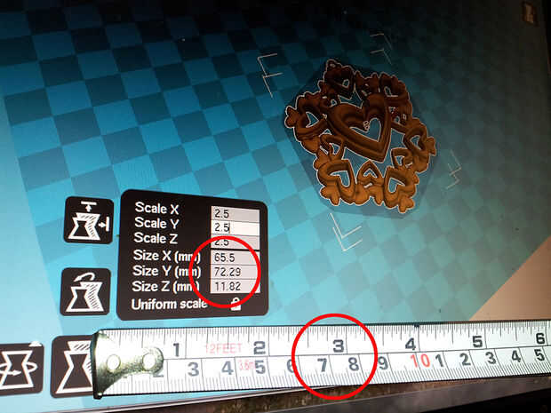 La escala de la stl en Cura es 21 para un 64 x 73 x 11 mm impresión.