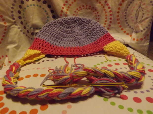 recoger todos los de la cadena para una trenza, colocar al final de la orejera, coser o atar a través de la orejera (lo hice) y lo de la trenza!