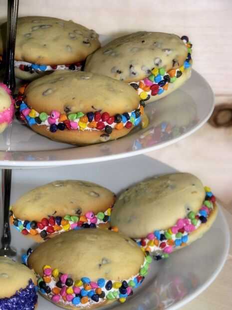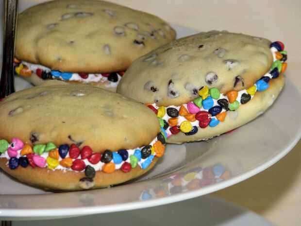 Tubo o cuchara de relleno en la parte plana de galleta y tapa con otra galleta. El rodillo los bordes en chispitas, si lo desea.