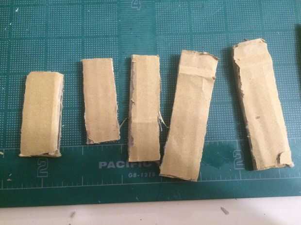 Usé 6 tiras de cartón para acoplarlos a las piezas superior e inferior del cartón. (Asegúrese de que hay un agujero para que la pieza de metal se puede pegar por la parte superior como en la imagen final).