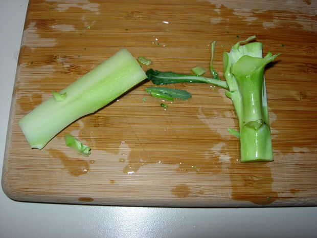 La base del tallo de la rebanada y luego agarrar el cuchillo en una mano con el pulgar extendido, al igual que lo haría para pelar una manzana. Cepille cuidadosamente el tallo de las porciones leñosas, dejándole el interior suave, verde-blanco. Esta es la magia. Después de probar esto, yo no fallo te para mantenerlo todo a ti mismo.