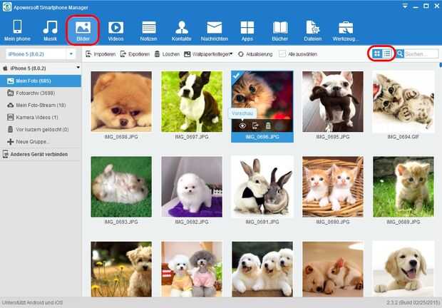 Nachdem deinem iPhone erkannt worden ist, klickst du im Hauptmenü auf das "Bilder" icono am oberen Rand. Dann kannst du hier alle Bilder auf deinem iPhone sehen. ¿Die veränderbar ist Ansicht: Große Symbole oder detalles, welche Weise findest du besser?