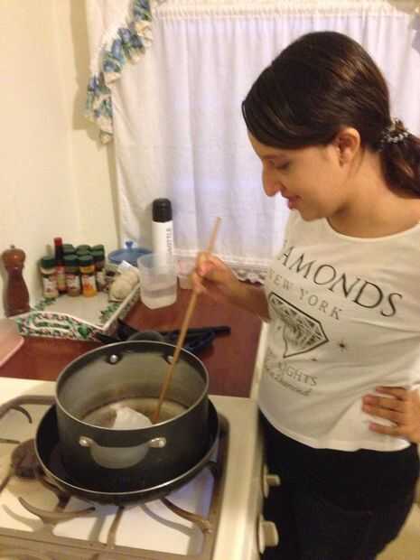 Wenn das parafina vollständig geschmolzen ist und eine flüssigeformig, gießen Sie die Essenz und den Farbstoff.