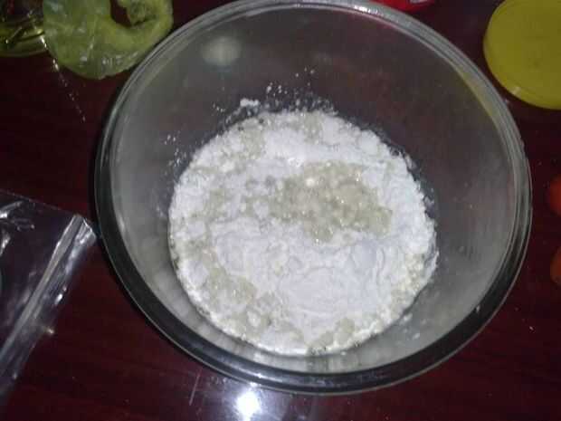 Actitudes en einer Schüssel, das legte und Esslöffel Hefe Esslöffel Zucker, nach, dass Sie, um das heiße Wasser en die Schüssel gießen mit einem Esslöffel Olivenöl ein Esslöffel haben salzen und 1 Tasse Mehl.