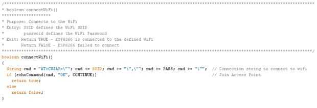 Esta función es las carne y las patatas de nuestro código. Así que lo que tenemos aquí es un comando (AT + CWJAP) que está diciendo nuestra ESP a un punto de acceso. Es seguido por el AP SSID y la contraseña. Si el ESP devuelve "OK" luego nos hemos con éxito unido a la AP. Si no, la conexión falló. Si estás usando un MEGA u otro microcontrolador multi serial que puede establecer hasta enviar la PC mensajes de lo que está sucediendo. Estoy enviando mis datos sobre I2C a una FPGA, por lo que sólo arrojó las respuestas.